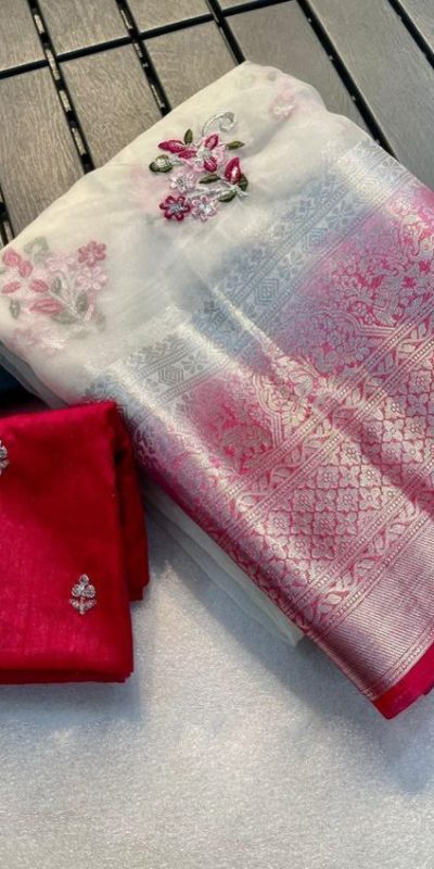 Perfect White Color Nylon Organza Jacquard Embroidered Saree