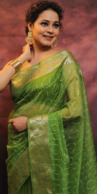 Artful Green Nylon Organza Jacquard Multi Embroidered Saree