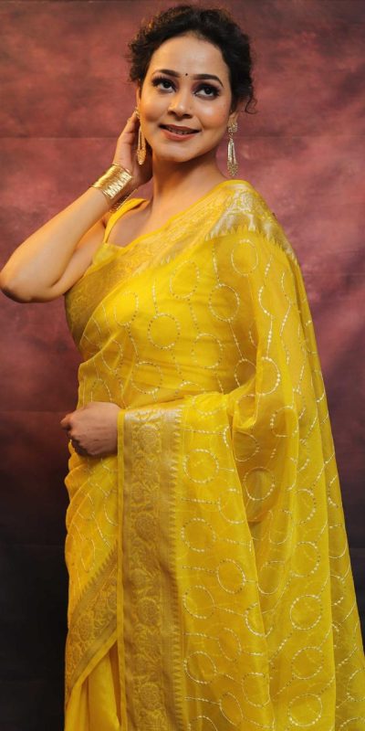Artful Yellow Nylon Organza Jacquard Multi Embroidered Saree
