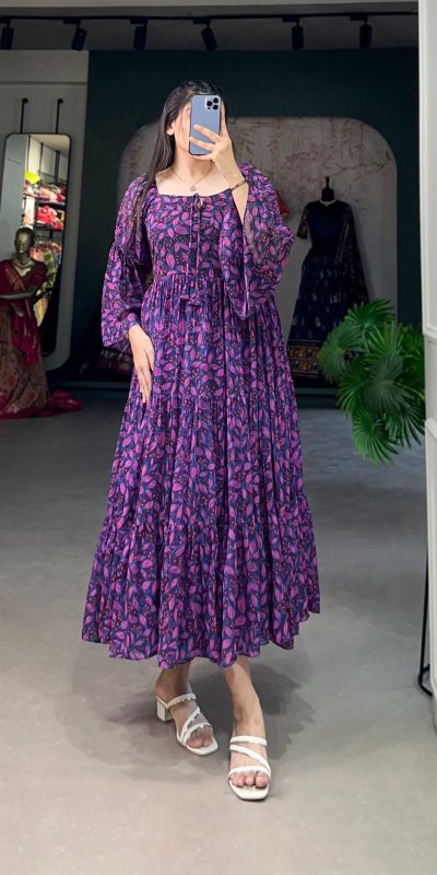 | Fabrics | Gown : Georgette Work : Floral Print Chest : 40″ (Inside 2 inch extra margin available so you can adjust support up to 42 for your body comfort ) Waist : 38″ Length : 47″ Flair : 8 Meter Sleeve length : 21 Lining : Micro Cotton (full upto bottom) |