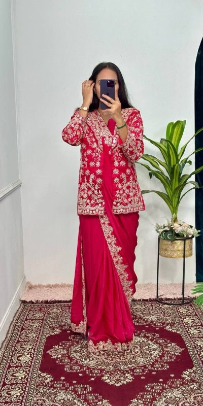Aglow Red Color Chinon Work On Koti With Lace Border Saree