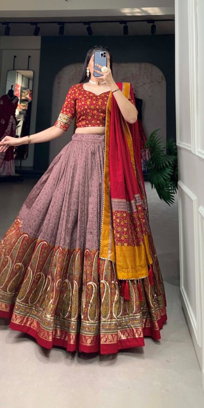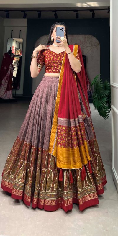LNB 1209 Red Color Tussar Silk Kashmiri Print With Foil Print Lehenga Choli Wedding, Party, Festive, Events Etc. Delivery 4-6 Working Days Rs 2599