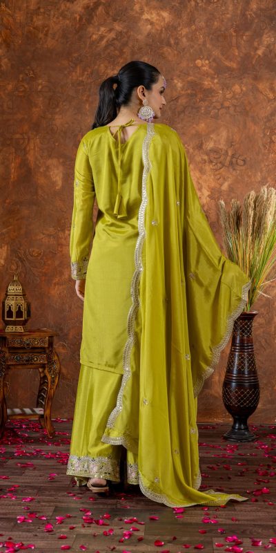 Green Chinon Silk Embroidery Sequence Coding Work Salwar Suit - Image 4