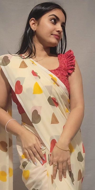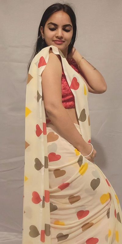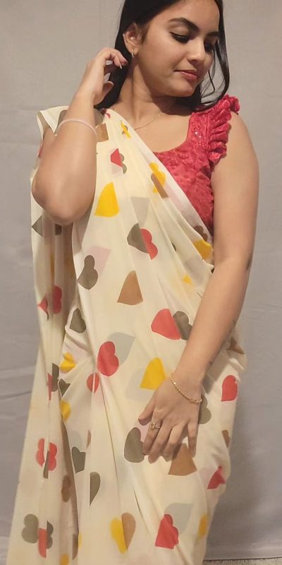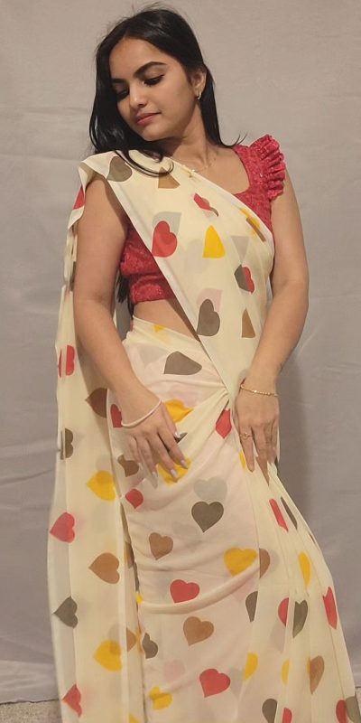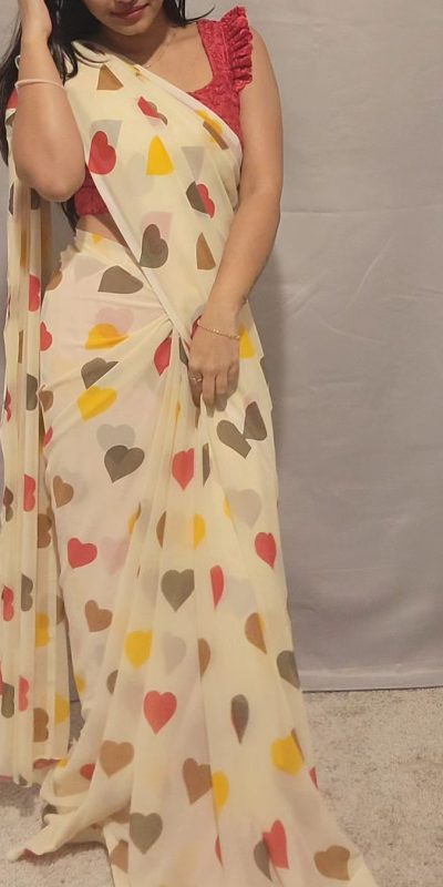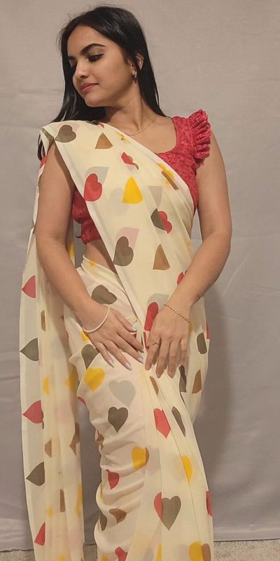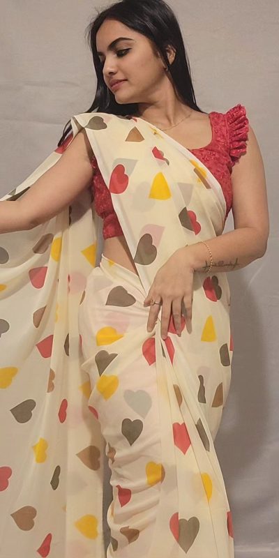 SC 215 Half White Color Soft Georgette Silk Digital Print Heart Design Ready To Wear Saree Casual, Wedding, Festive, Events . Expected Delivery 4-6 Working Days @1499/- only