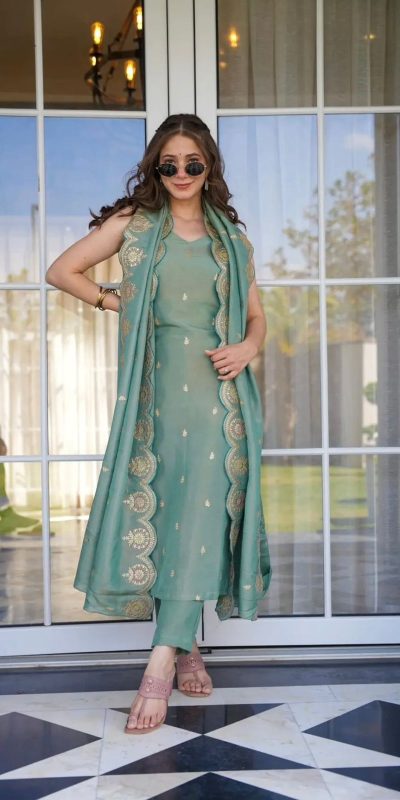 Artful Peacock Green Color Chinnon Silk Embroidery Salwar Suit