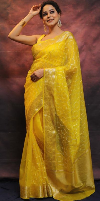 Artful Yellow Nylon Organza Jacquard Multi Embroidered Saree