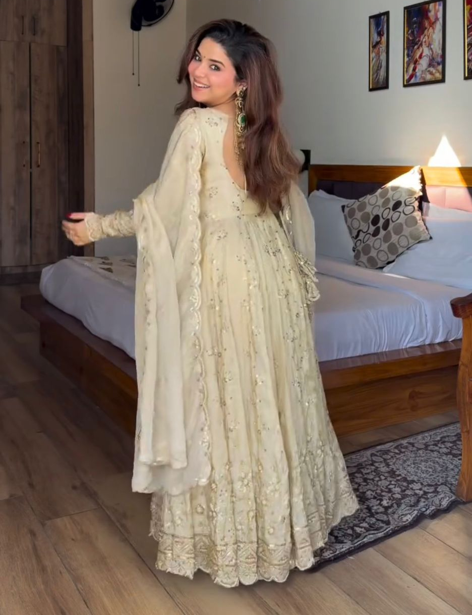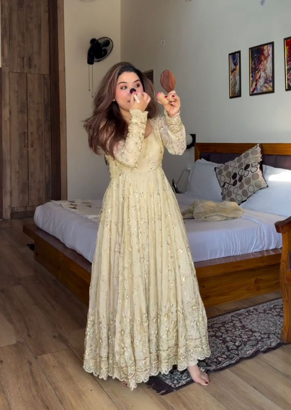 Gown ka flare utna wide nahi jitna pic me lag raha tha, thoda disappoint hui. But walking easy hai, tangling ka issue nahi. Material smooth, machine wash friendly, ironing ke baad handsome lagta hai.