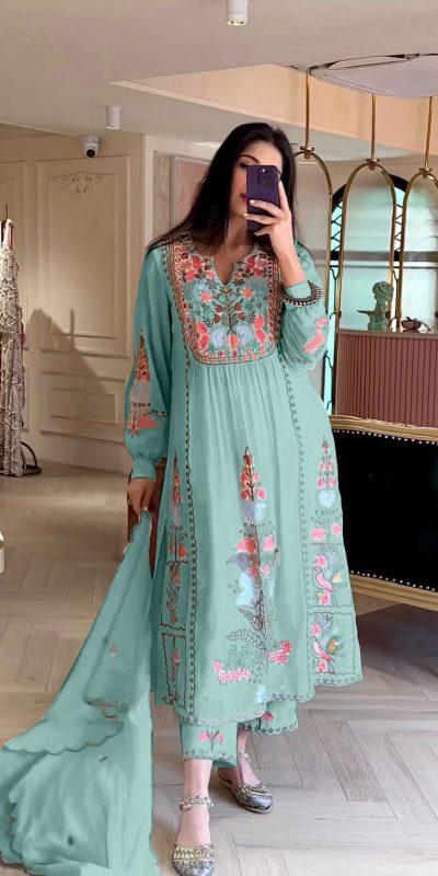 Awesome Peacock Blue Color Georgette Embroidery Salwar Suit