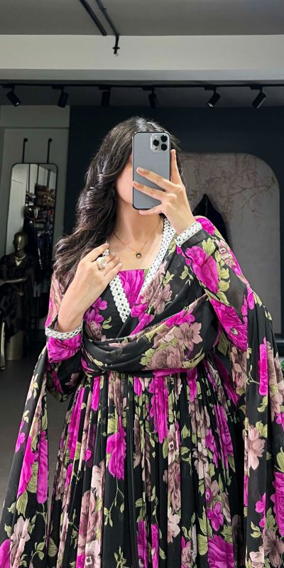 Fabrics  Gown Fabric : Georgette Gown Work : Floral printed with Paper Mirror Lace Touch Up Chest : Free Size Semi Stitched  Waist : 38" Length : 57" Flair : 3.50 Meter Sleeve length : Full Sleeve : 25 inch Half Sleeve : 16 inch Lining : silk (full upto bottom)Dupatta Fabric : Georgette Dupatta Work : Floral print with Paper Mirror Lace Touch Up Dupatta Length : 2.40 Meter