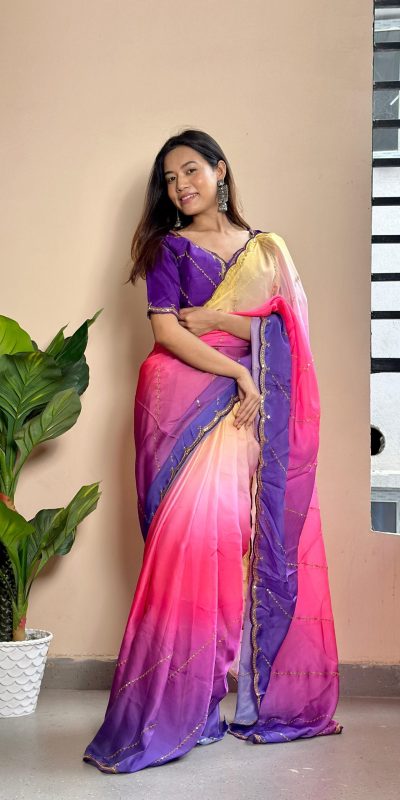 AC Satin Purple Color Soft Georgette Satin With Digital Print Embroidery Work Saree Casual, Wedding, Festive, Events . Expected Delivery 4-6 Working Days @2299/- only