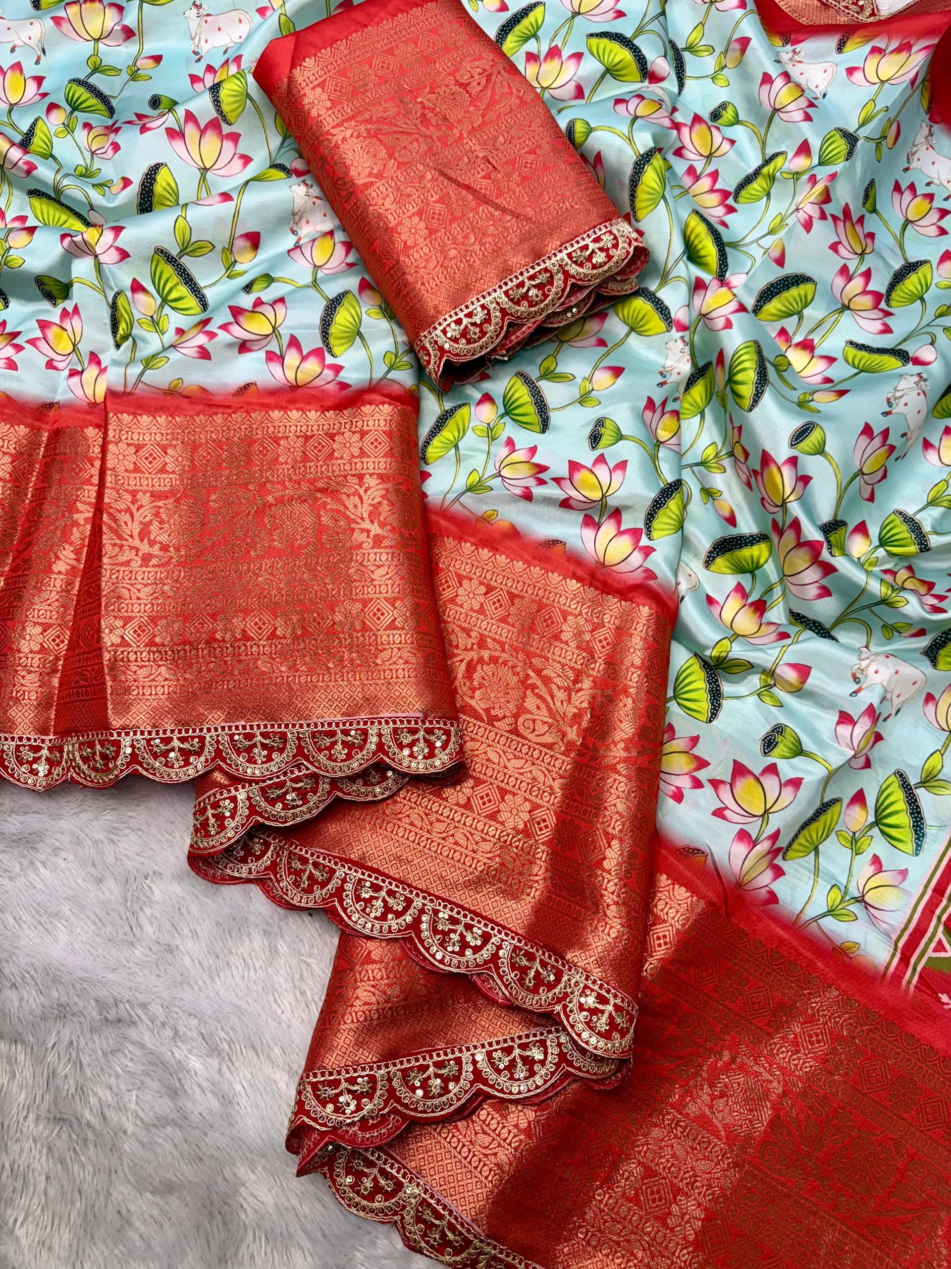 Fabrics Saree : Dola silk Saree With Zari Weaving Border And Also All Over Print On This Saree And Printed Pallu And Blouse