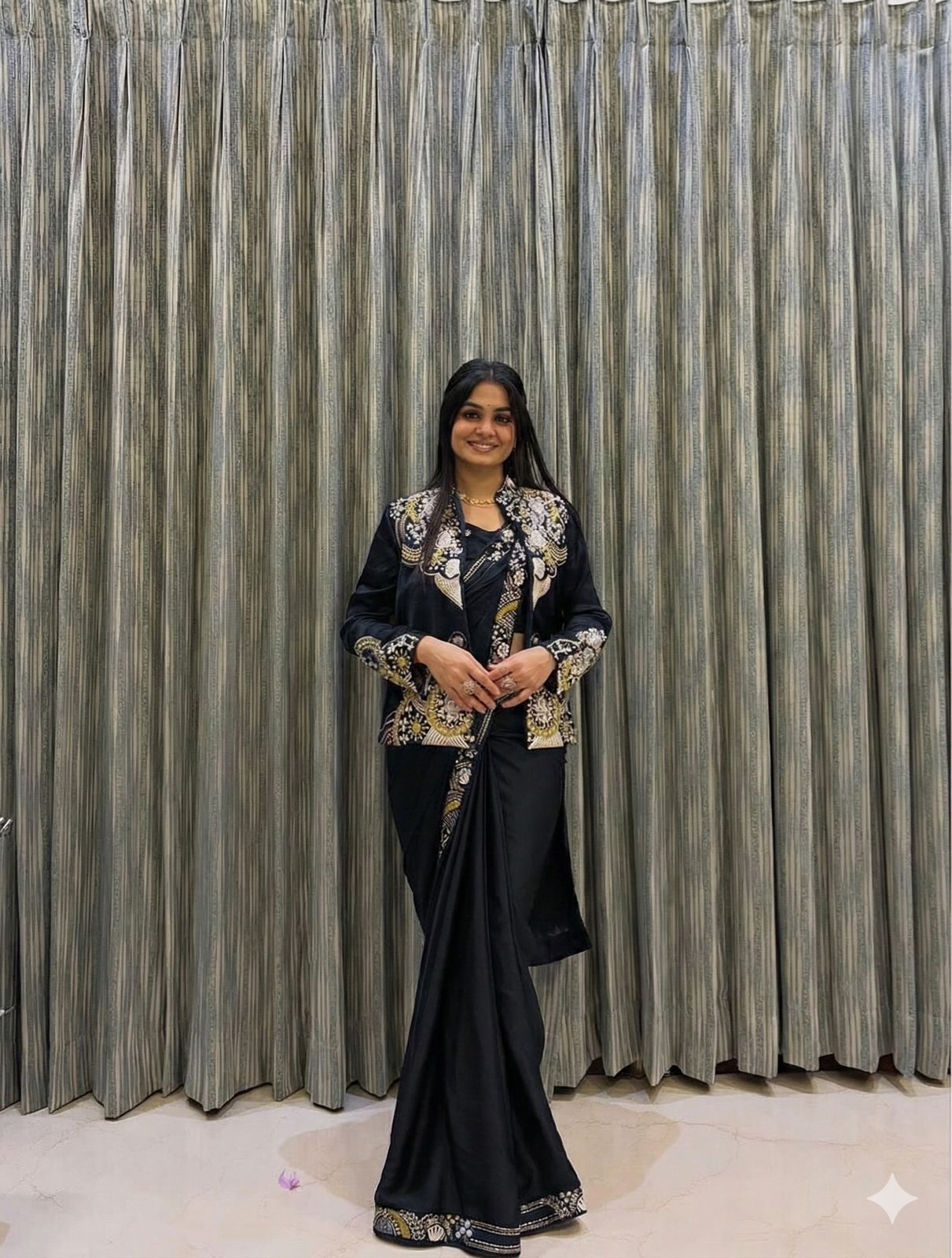 Silk blend Indian saree ke palloo me thodi stiffness hai; filmy flow expect ho toh disappointment, structured drape pasand ho toh fine.