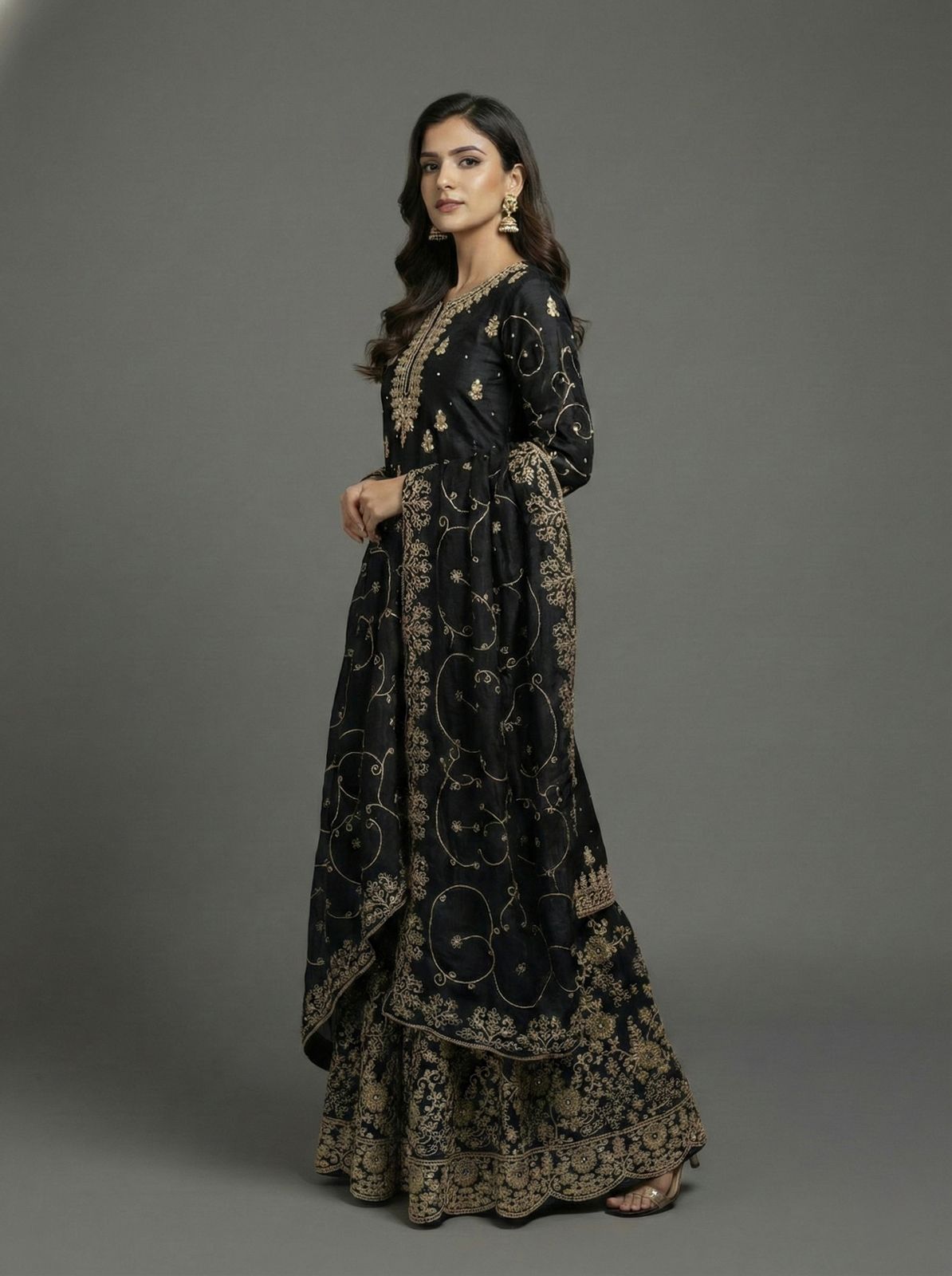 Black Crunchy Silk Lace Embroidery Work Gown