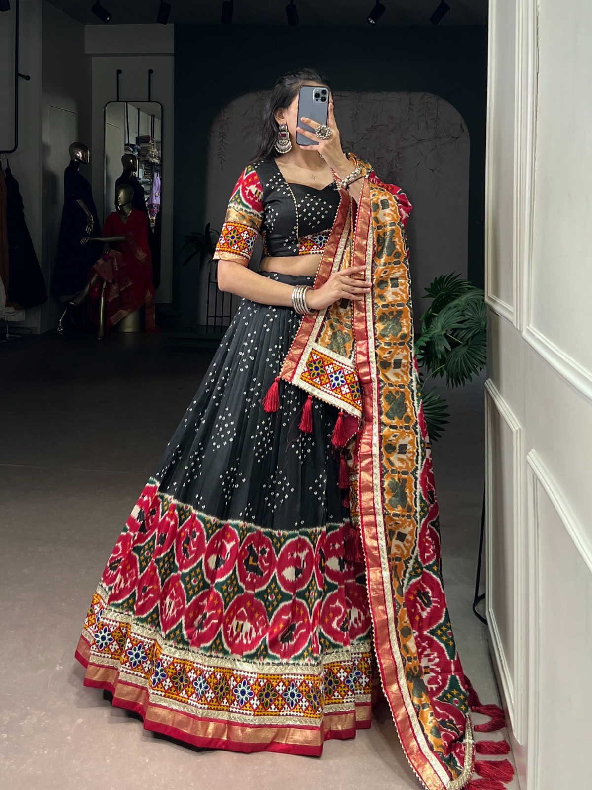 Black Tasar Silk Gamthi Work Lehenga Choli