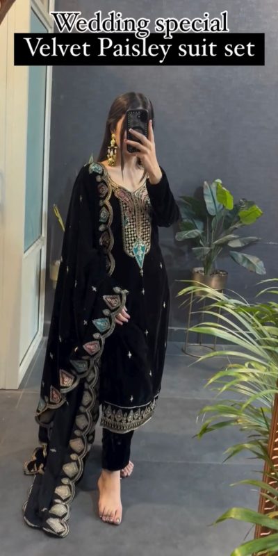 Black Viscose Velvet With Embroidery Work Salwar Suit