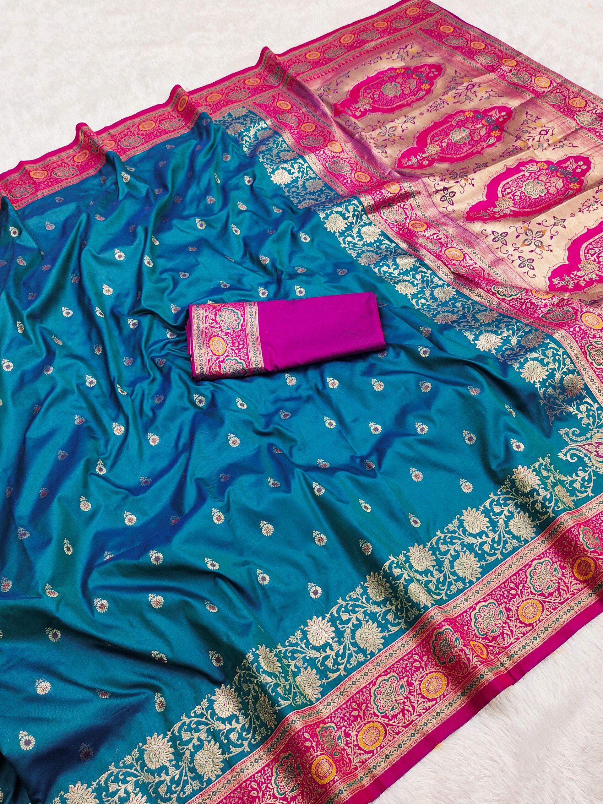 Saree :- Rich Banarasi silk saree with golden butta motifs, complemented by an intricate and gold zari border and pallu featuring paisley designs.
