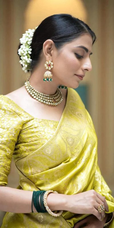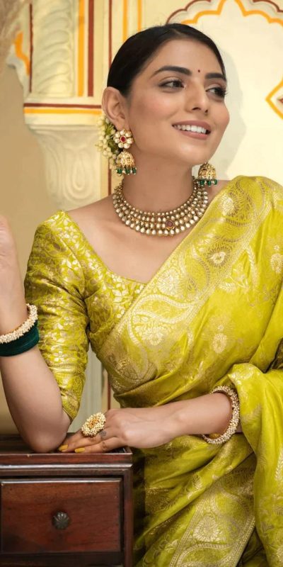 Bright Lemon Yellow Color Soft Litchi Silk All Over Weaving Saree