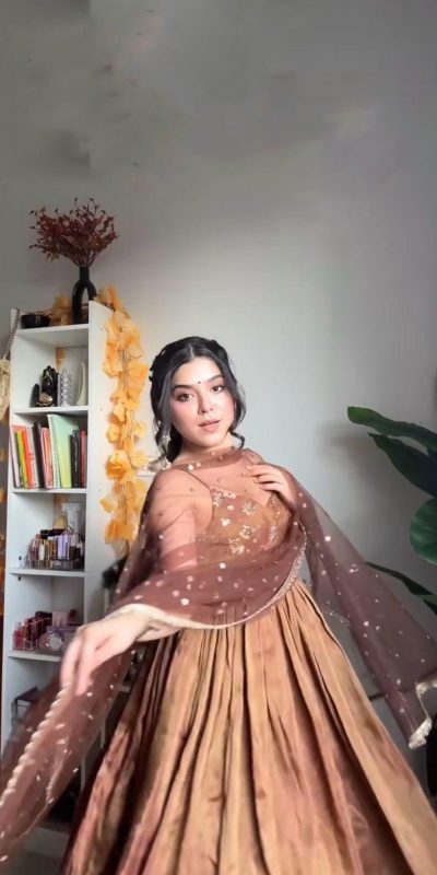 SRK 5239 Brown Color Fendi Silk With Embroidery Sequence Work Anarkali Gown Wedding Party, Festive, Events Etc.4-6 Working Days@1999/- only
