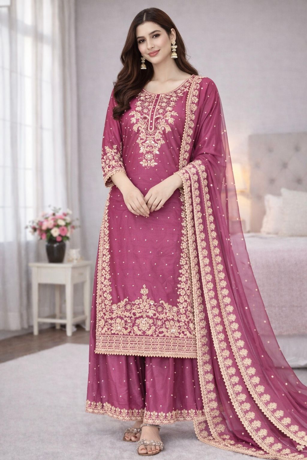 Classic Rani Pink Organza Silk Embroidery Work Salwar Suit