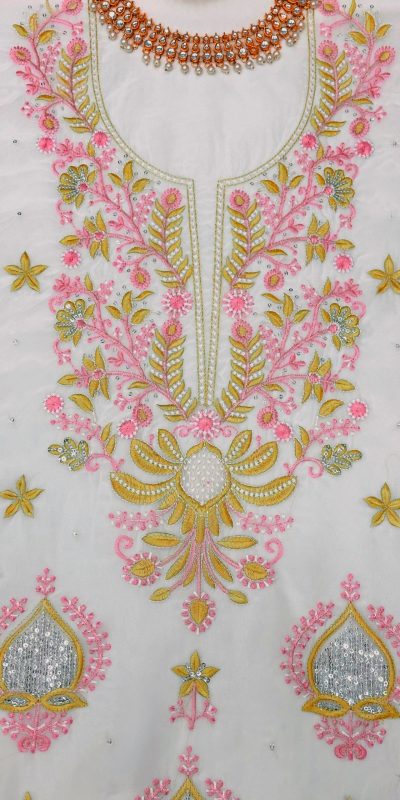 Fabrics  Top :Tabby organza silk Work : thread with Sequence Inner. : micro Stitching type : Unstitch (only fabric 1.60m) with sleeve (0.45m )   Bottom Fabrics : tabby Organza silk Work. : thread with Sequence Stich. : Unstitch (1.60m) Dupatta Fabrics : Tabby silk Work : Thread with Sequence Length. : 2.20 meters