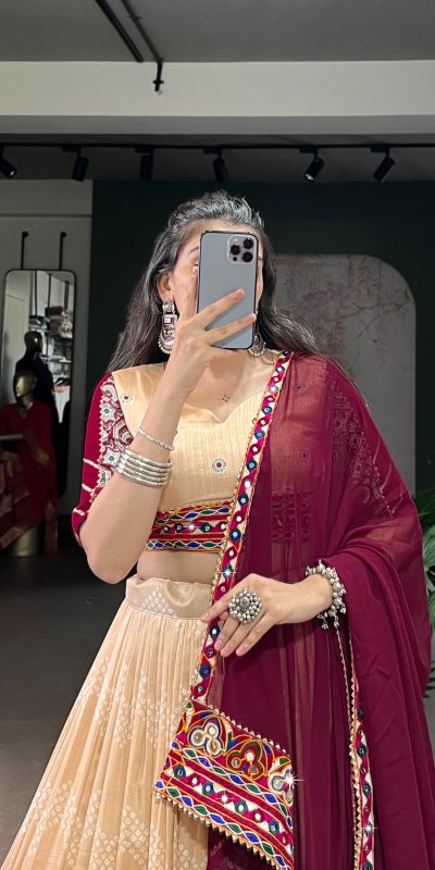 Cream Tasar Silk Gamthi Work Lehenga Choli
