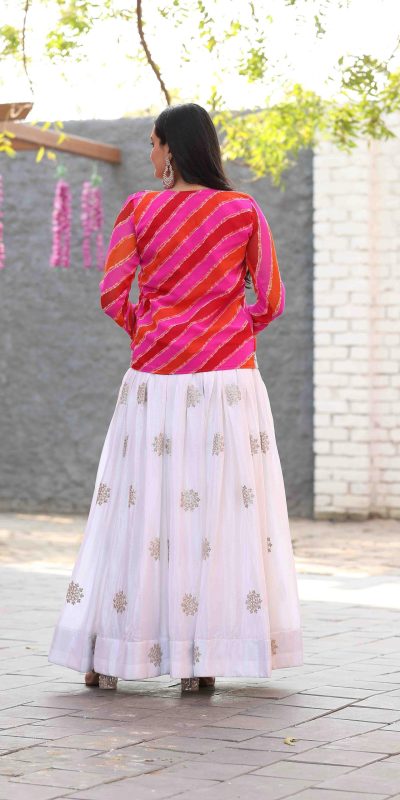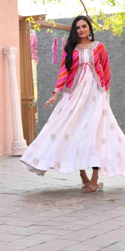 | Fabrics | Fabric : pure chinon Inner : Micro Cotton Work : cording 3mm sequence Embroidery work Stitch : Free Size Semi Stitched Size : Free Size Semi Stitched Jacket Fabric : Pure leheriya Inner:-Micro Cotton Work : cording 3mm sequence Embroidery work Size: M up to L margin XL up to 2xl margin |