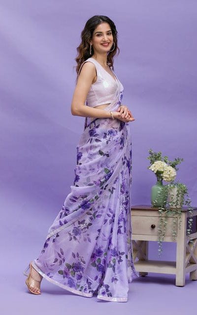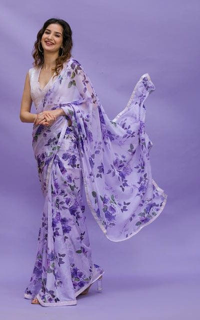 RS 45 Violet Color Floral Digital Printed Georgette Lace Border Saree Casual, Party, Wedding, Festive, Events . Expected Delivery 4-6 Working Days @1799/-
