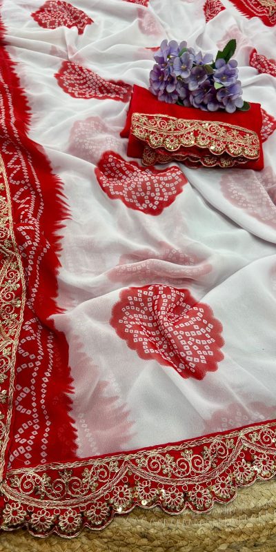 | Fabrics | Saree : Georgette work : Red & White With Codding Sequence Cutwork Lace Border On Sarees Along With Banglori Blouse with embroidery lace Blouse : Mono Banglori