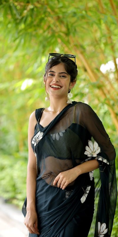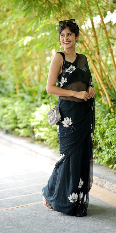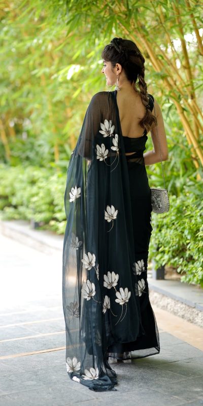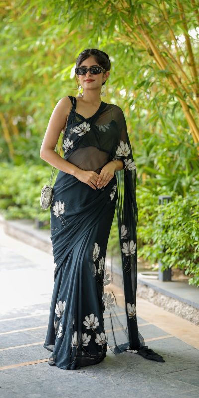 | Fabrics | Saree Fabric : Pure Soft Georgette Silk Design : flower design on all over the body and pallu Ready To Wear saree beautiful color combination All over the body Blouse : black color banglory silk running unstitched blouse piece |