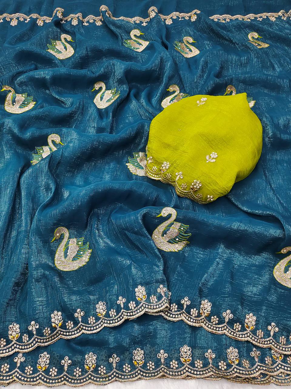 Saree Detail Saree Fabric : Crunchy Chiffon Saree Flower embroidered and Both Hand Moti Work & Diamond Work with Contrast Embroidery Blouse Piece. Blouse Fabric : Crunchy Chiffon Saree Cut : 5/50 |