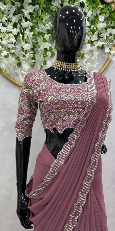 Glamorous Peach Color Georgette Thread Sequence Work Saree