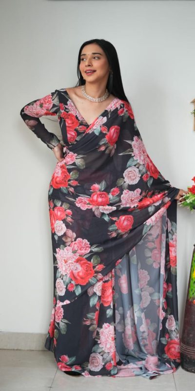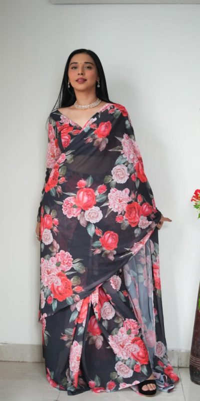 | Fabrics | Fabric : pure soft Georgette silk Work : beautiful flowers design All over Blouse :Beautiful same Blouse piece |
