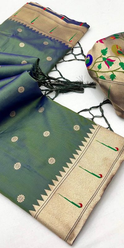 Saree :- A Pethani silk saree are woven using silk yarn and embellished with golden zari & Meenakari threads unique Motifs.