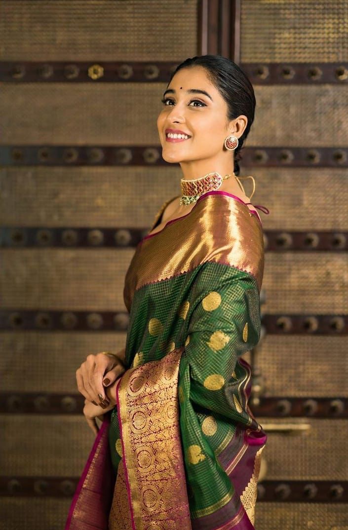 Vibrant hues and intricate motifs give this saree a festive, elegant look.
