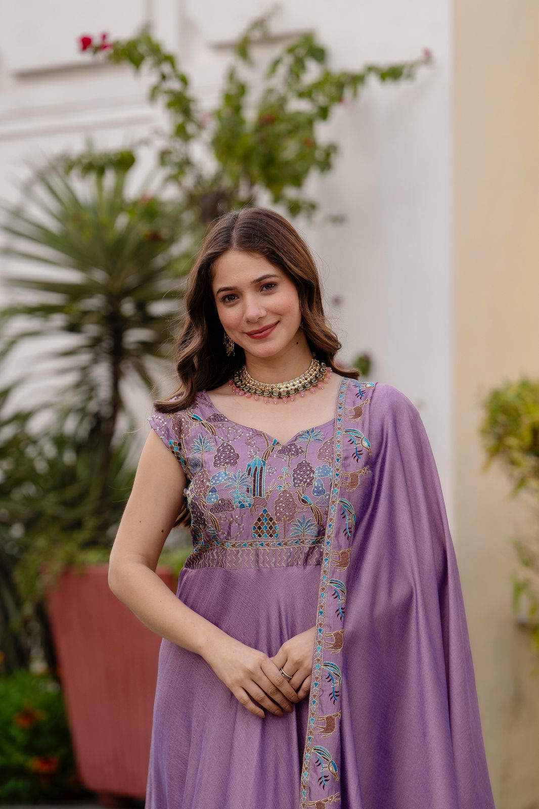 Lavender Vichitra Silk Embroider Work Gown