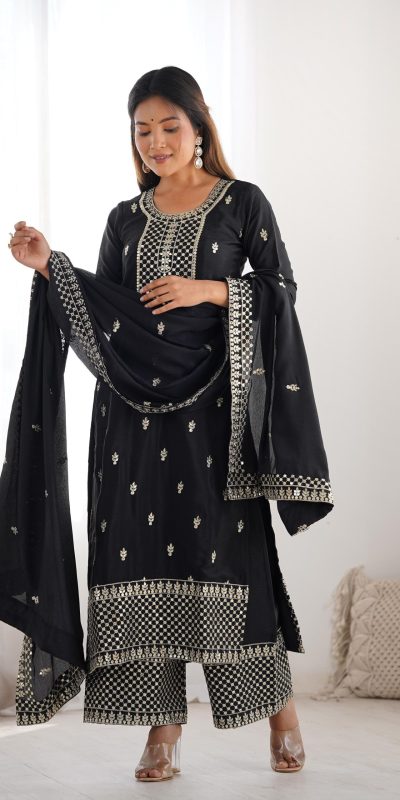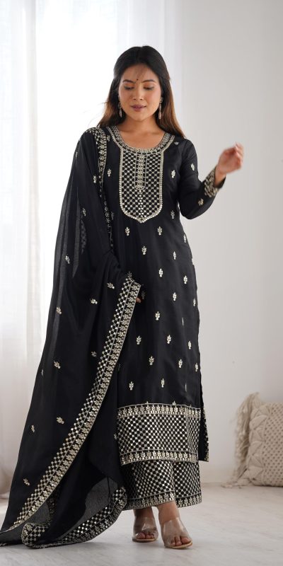 Lovely Black Color Chinon Silk Embroidery Jari Work Salwar Suit