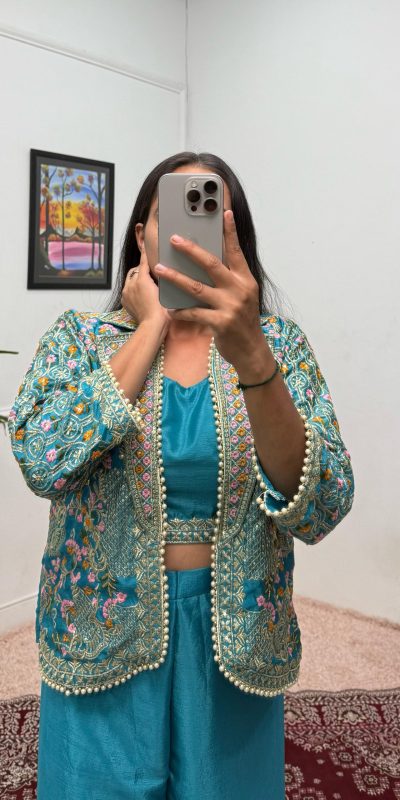 | Fabrics | Koti Fabric:- Chinon Work:- Front Side Full Embroidery Work With Moti Lace Work fancy Lace /Size : Free Size Semi Stitched Sleeve :- 18 Inch Height :- 25 Inch Blouse Fabric :- Chinon Palazzo Fabric :- Chinon |