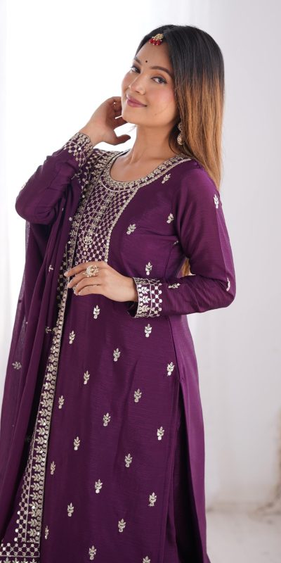 Lovely Wine Color Chinon Silk Embroidery Jari Work Salwar Suit