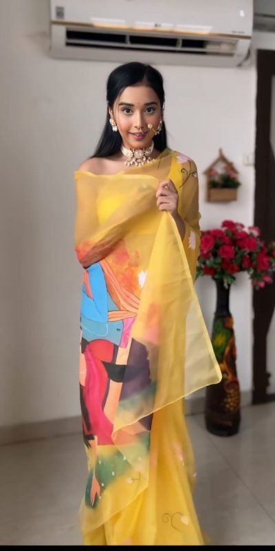 | Fabrics | Saree Fabric : pure soft Organza silk Saree Work : All over the body Saree : 5.5 Mtr Blouse Fabric :Yellow Blouse Blouse : 0.80 Cmtr Ready To Wear saree |