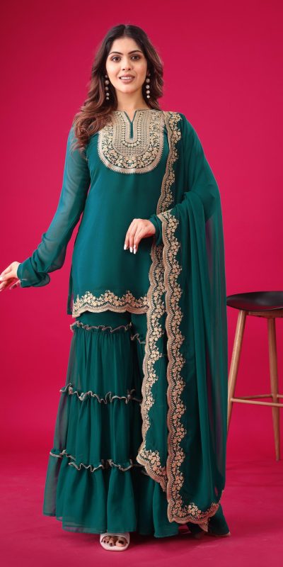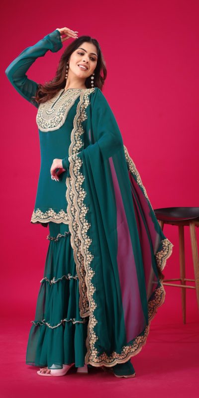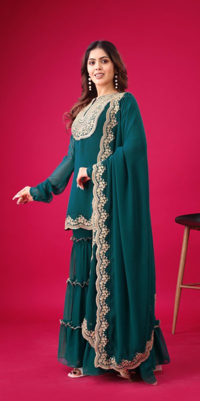 | Fabrics | Top Fabric :Blooming Faux Georgette With Heavy Embroidery 3mm Sequence Thread Work With Full Sleeve Top Inner : Heavy Micro Cotton Top Size : Free Size Fully Stitched Ready To Wear Top Length : 31-32 inchPalazzo Fabrics : Blooming Faux Georgette With Elastic Full stitched Palazzo inner : Heavy Micro Cotton Length: 40-41 Inch fully stitched Dupatta Fabric : Blooming Faux Georgette With Embroidery 3mm Sequence Work With Lace Border |