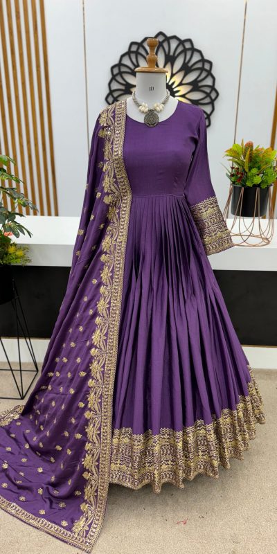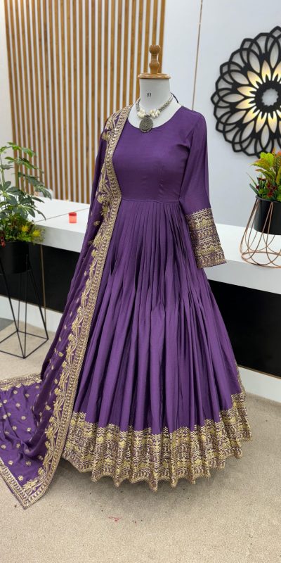 | Fabrics | Gown Fabric : Heavy Chinon Silk Inner : Heavy Micro Cotton Work :Heavy Chinon Silk Gown Length : 53-54 Inches Flair : 3 Meter Bottom Fabric : No Dupatta Fabric : Heavy Chinon Silk and Heavy Embroidery Sequence work and Lace Border |
