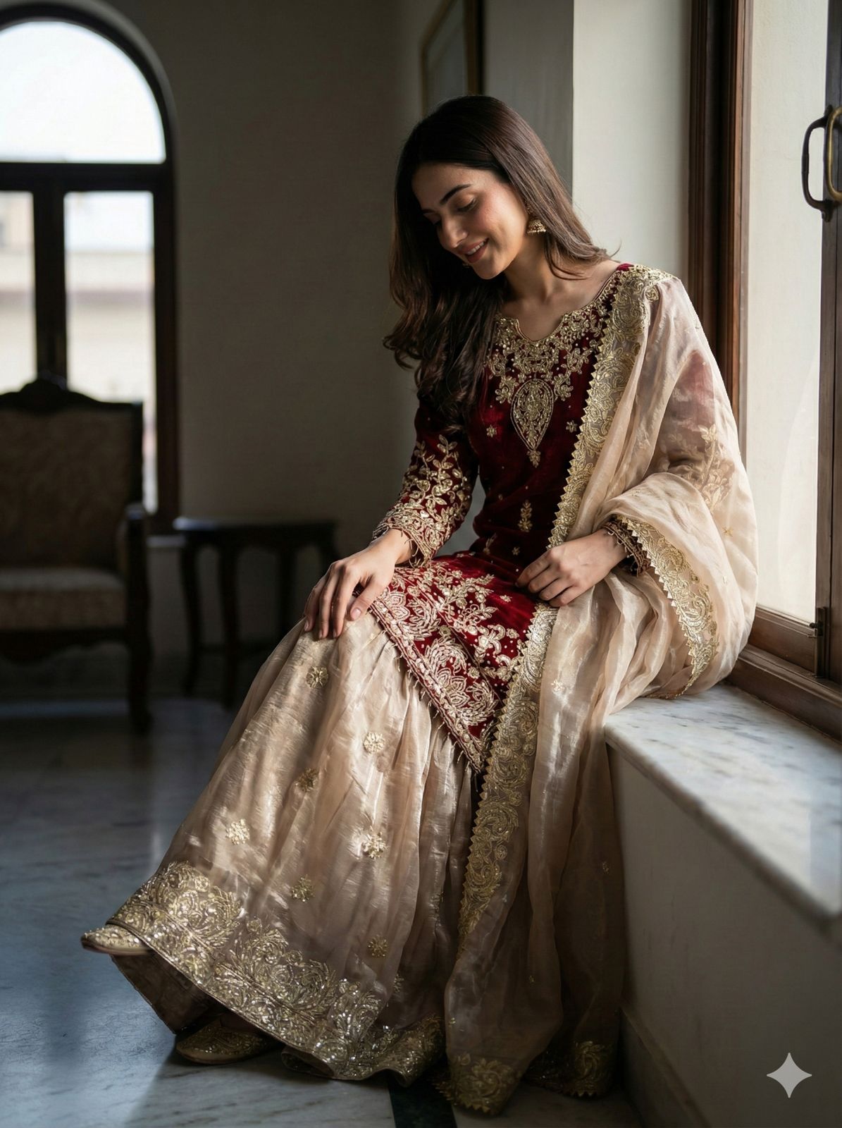Sharara  Fabrics :Heavy Zimmy Choo With Heavy 3 mm Embroidery Coding Dori-Sequence Work And Rivet Moti Work With Elastic