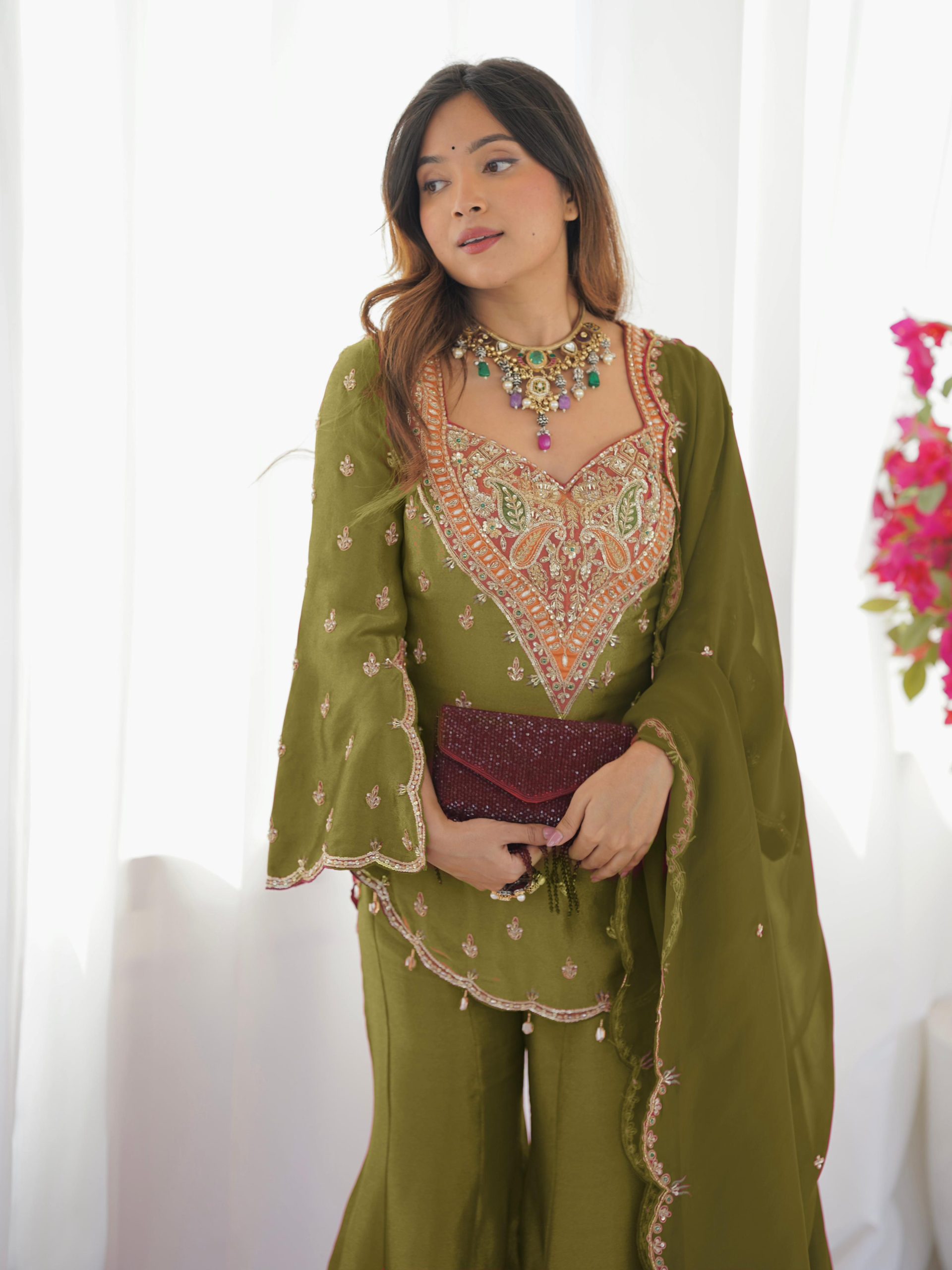 Mehandi Simar Silk Embroidery Work Salwar Suit