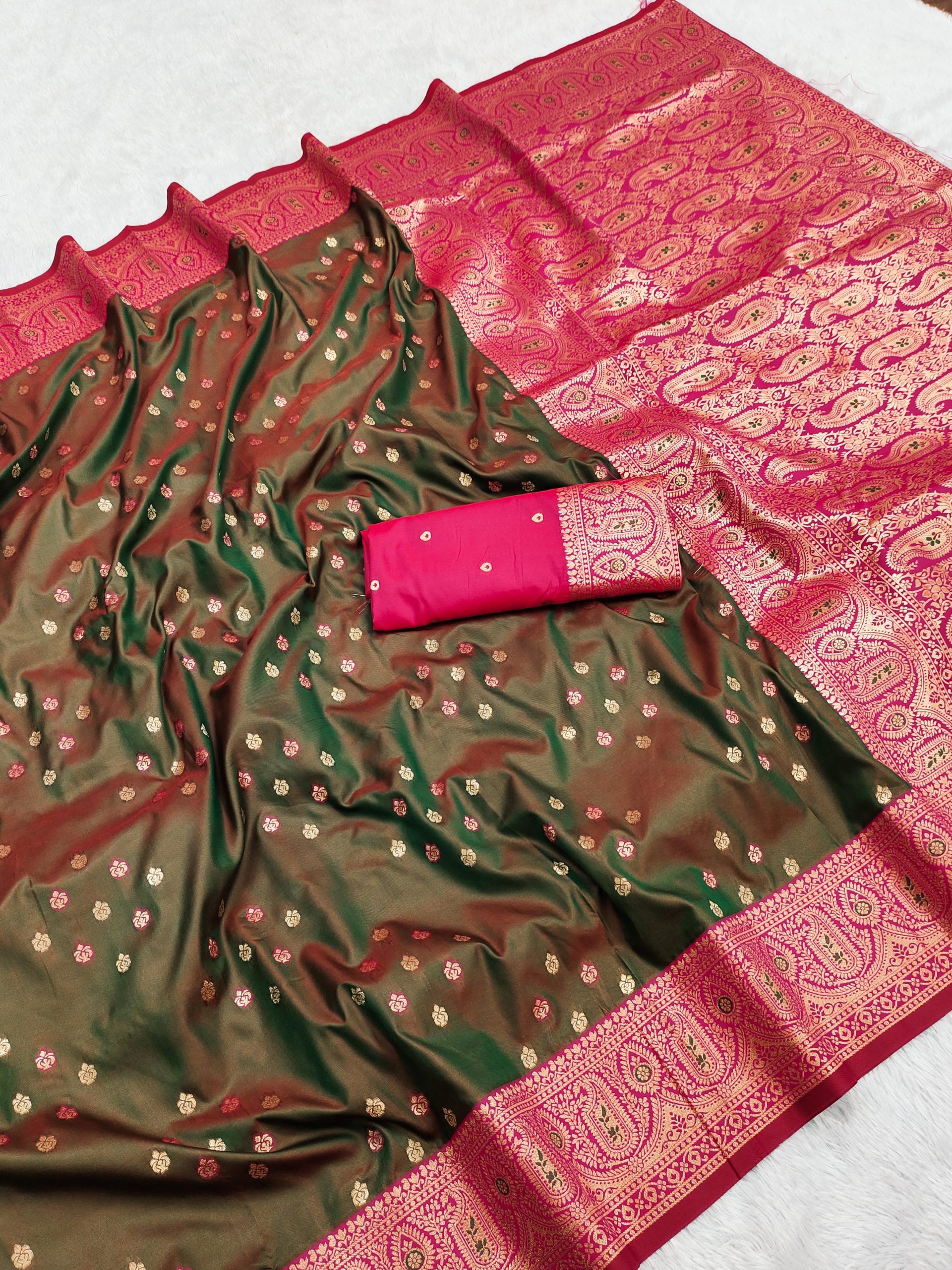 Saree :- Rich Banarasi silk saree with golden butta motifs, complemented by an intricate and gold zari border and pallu featuring paisley designs.