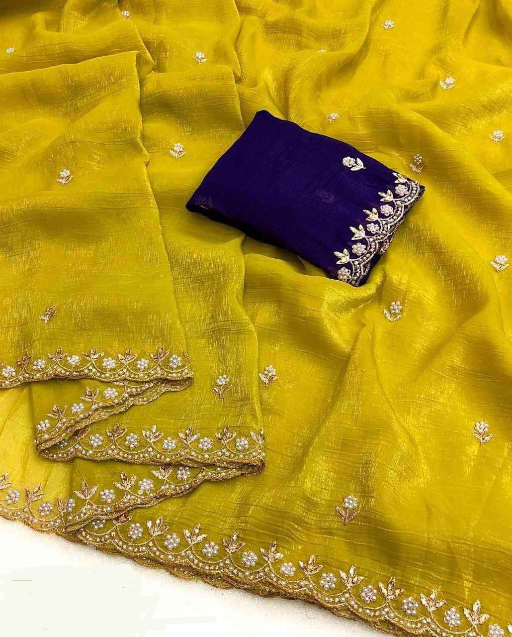 Mustard Crunchy Chiffon Embroidery Work Saree