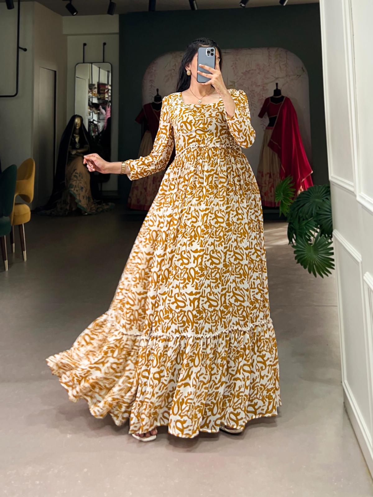 Fabrics | Gown Gown Fabric : Georgette Gown Work : Printed Chest Size : 38” (M) (Inside 2 inch extra margin support up to 40 for your body comfort) Waist Size : 38" Shoulder : 15" Sleeve Length : 18" Length : 57" Flair : 4.50 Meter Lining : Cotton (full upto bottom) |