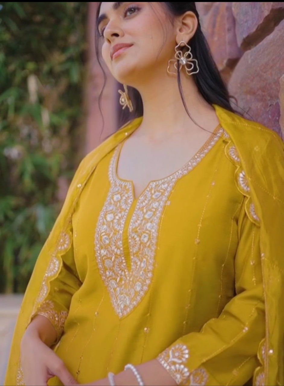 Mustard Pure Chinon Embroidery Salwar Suit