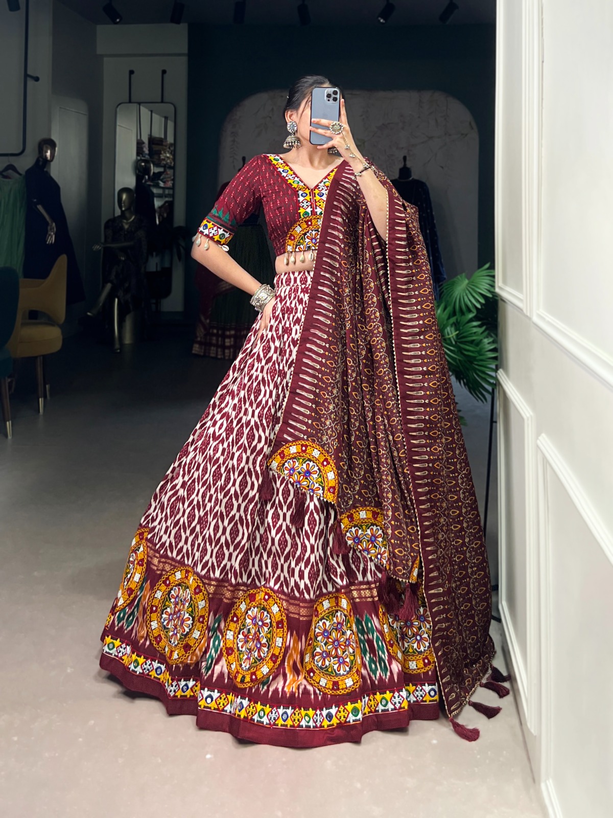Lehenga Work : Ikkat Print With Foil Work And Original Mirror Gamthi Work