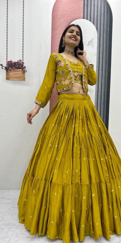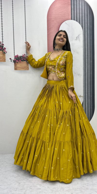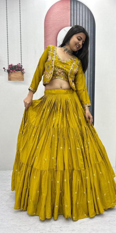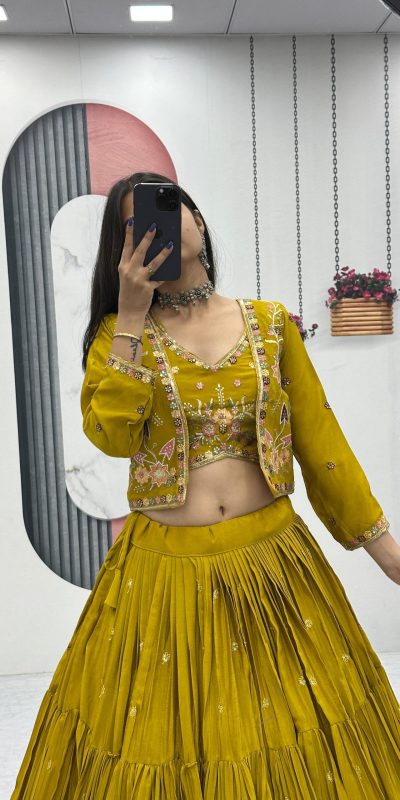 Mustered Chinon Thread Embroidery Lehenga Choli