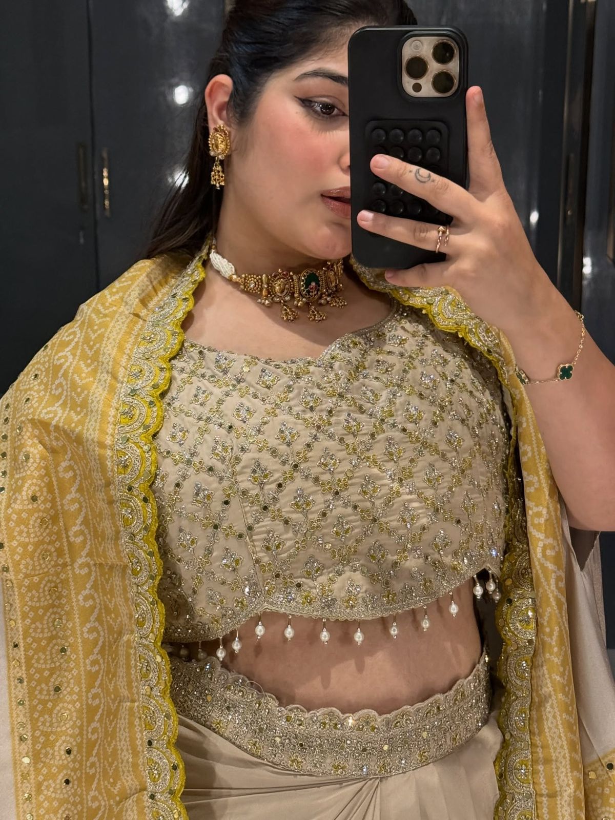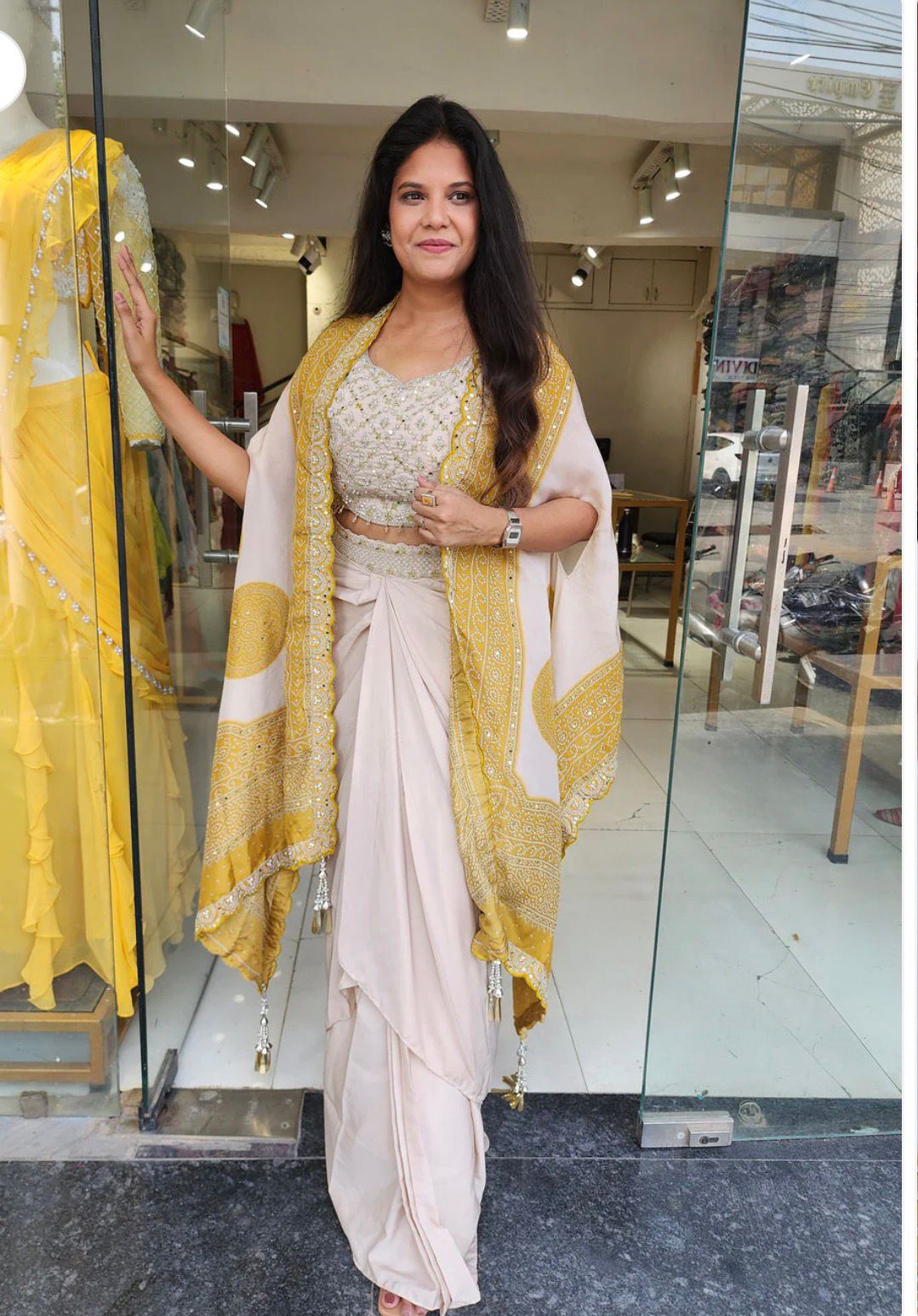 Mustered Crap Silk Embroidery Mirror Work Dhoti Suit